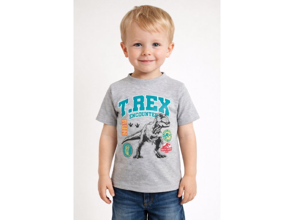 Dětské tričko s krátkým rukávem v šedém melírovaném provedení a ikonickým motivem Jurassic World. Vyrobeno ze směsi 95 % bavlny a 5 % viskózy, která zajišťuje měkkost a stálost materiálu.